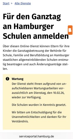 die Behörde hat uns informiert, dass aktuell aufgrund unaufschiebbarer Wartungsarbeiten der Online-Dienst leider nicht zur Verfügung steht.