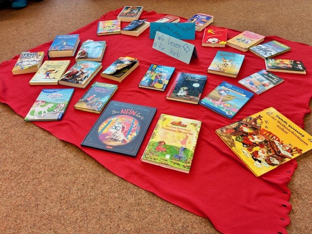 Zusammen mit ihren Lehrerinnen organisierten sie einen Bücher- und Spieleflohmarkt, bei dem 147,52.-€ zusammen kamen.