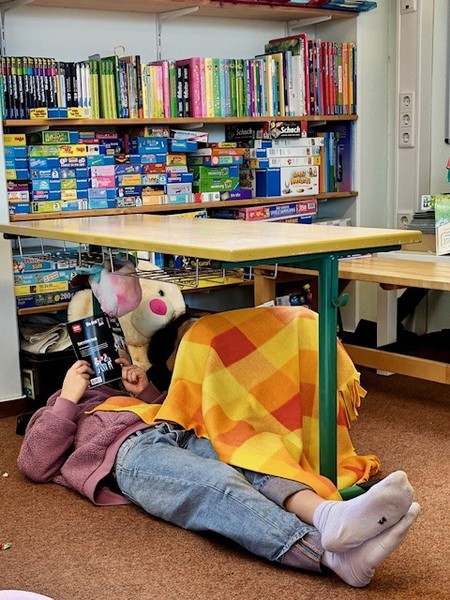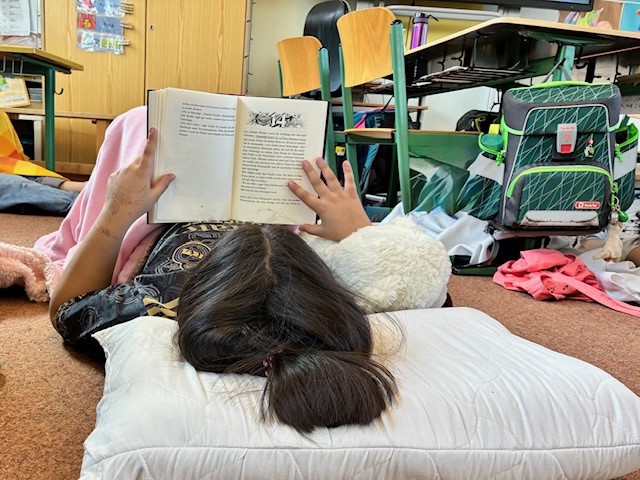 Dann ging das Schmökern los. Mit einem kuscheligen Kissen, einer Decke und einem selbst gewählten Buch haben wir zweimal 45 Minuten gelesen.